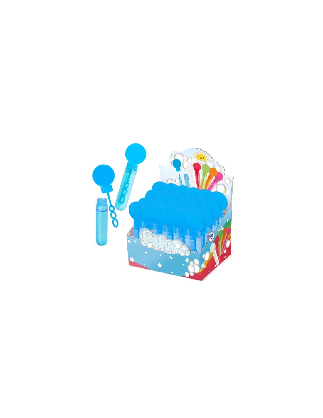 Incluye líquido jabonoso (capacidad 30 ml), se sirven en estuche expositor de 24 uds. por color (PRECIO PACK). (medida caja pomperos 29,5x14,5x13,5 cm)